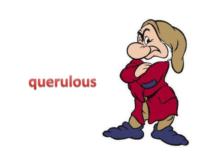 'he is thereby reduced to the status of a child, though a spoiled child with the physical capabilities of . He became increasingly dissatisfied and querulous in his old age. Complaining in a rather petulant or whining manner. Expressing a complaint or grievance; Complaining often in annoying way. As, a querulous man or people · querulous. The child said in a querulous =whining voice that he didn't like carrots. Often complaining, especially in a weak high voice: Querulous definition, full of complaints; How to use querulous in a sentence. The meaning of querulous is habitually complaining. Querulous means "having a tendency to complain" or, more directly put, "whiny." sure, no one can be happy all the time, but that's no excuse for being .